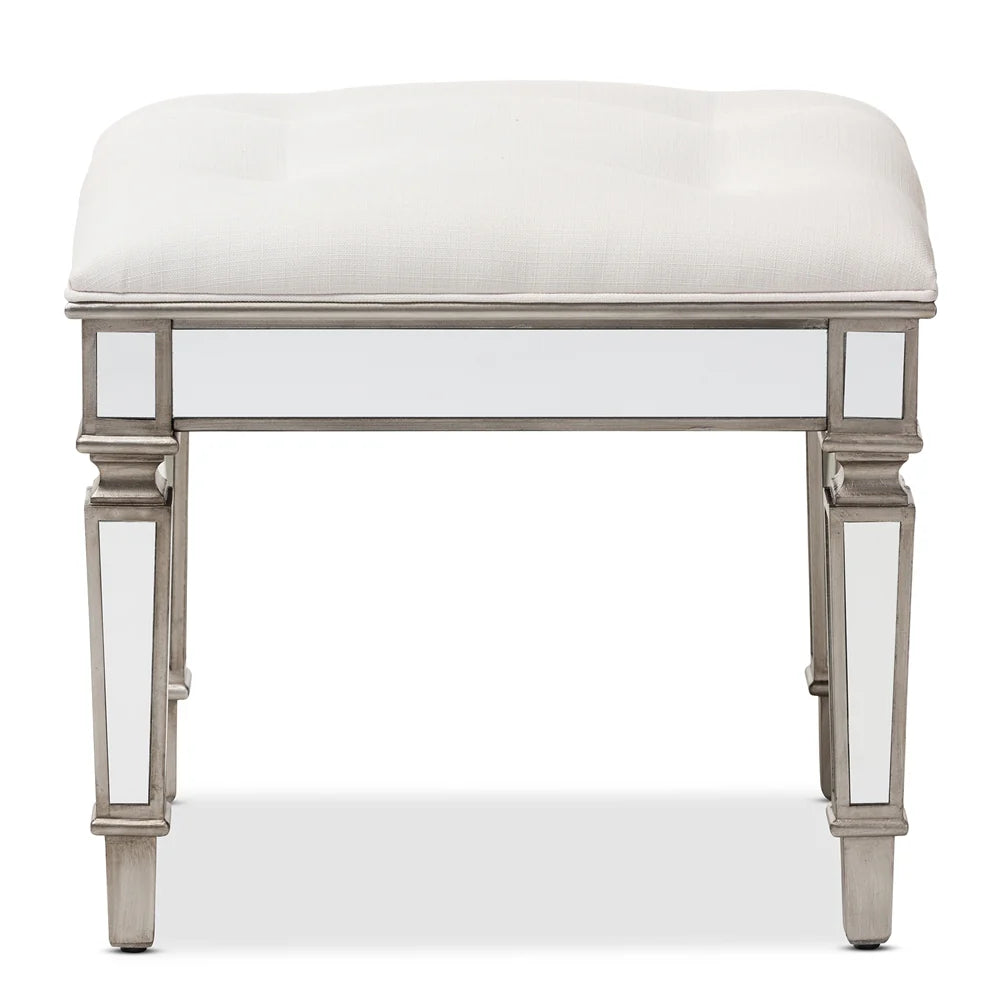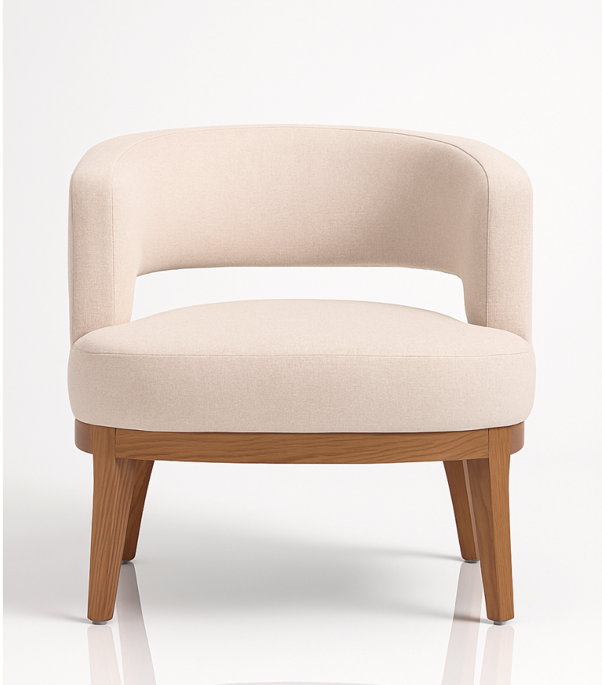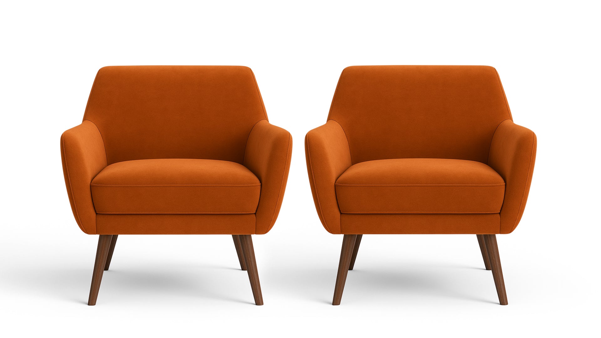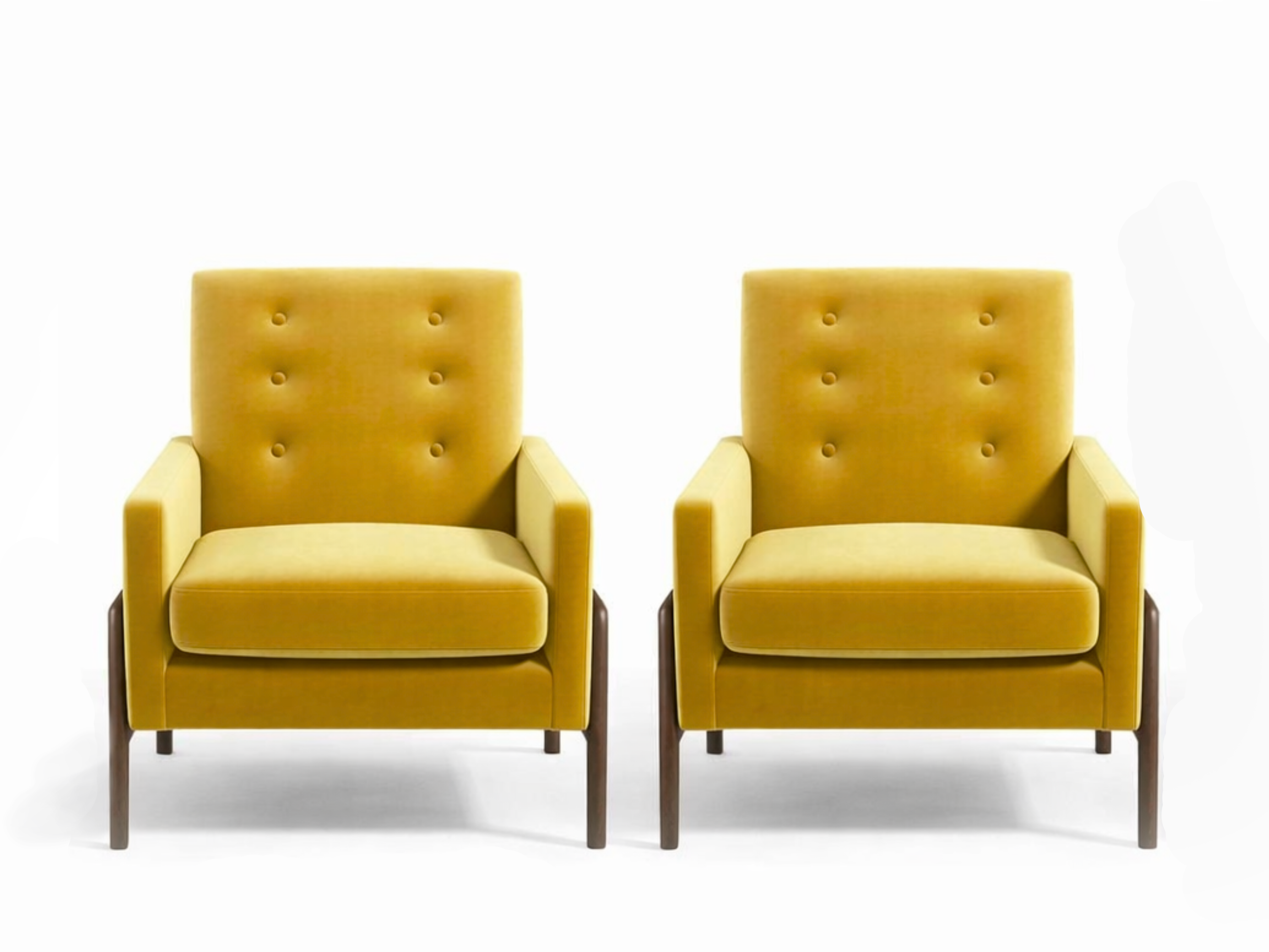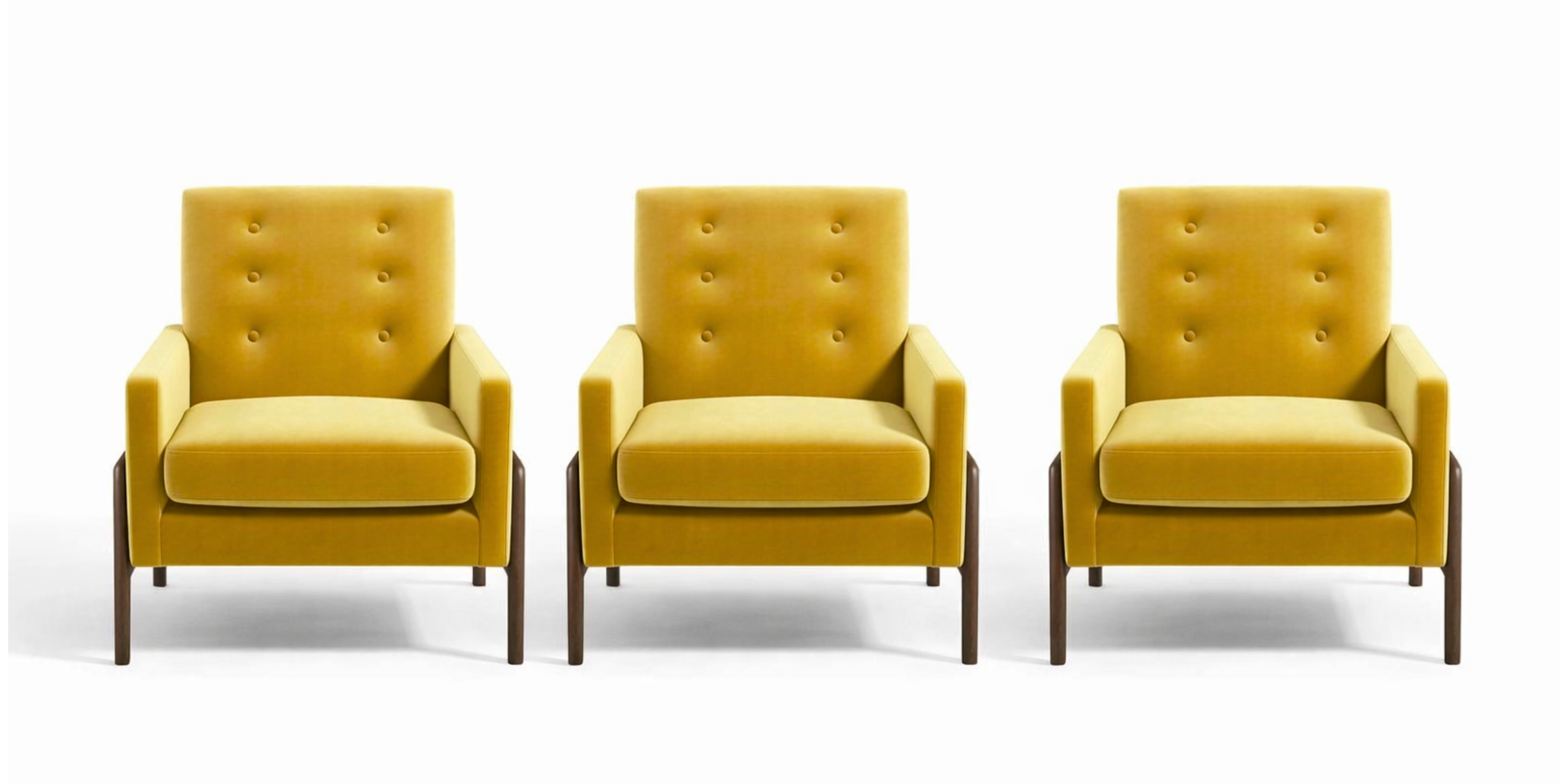 Green armchair with gold base on a wooden floor against a white wall Green armchair with gold base on a wooden floor against a white wall
