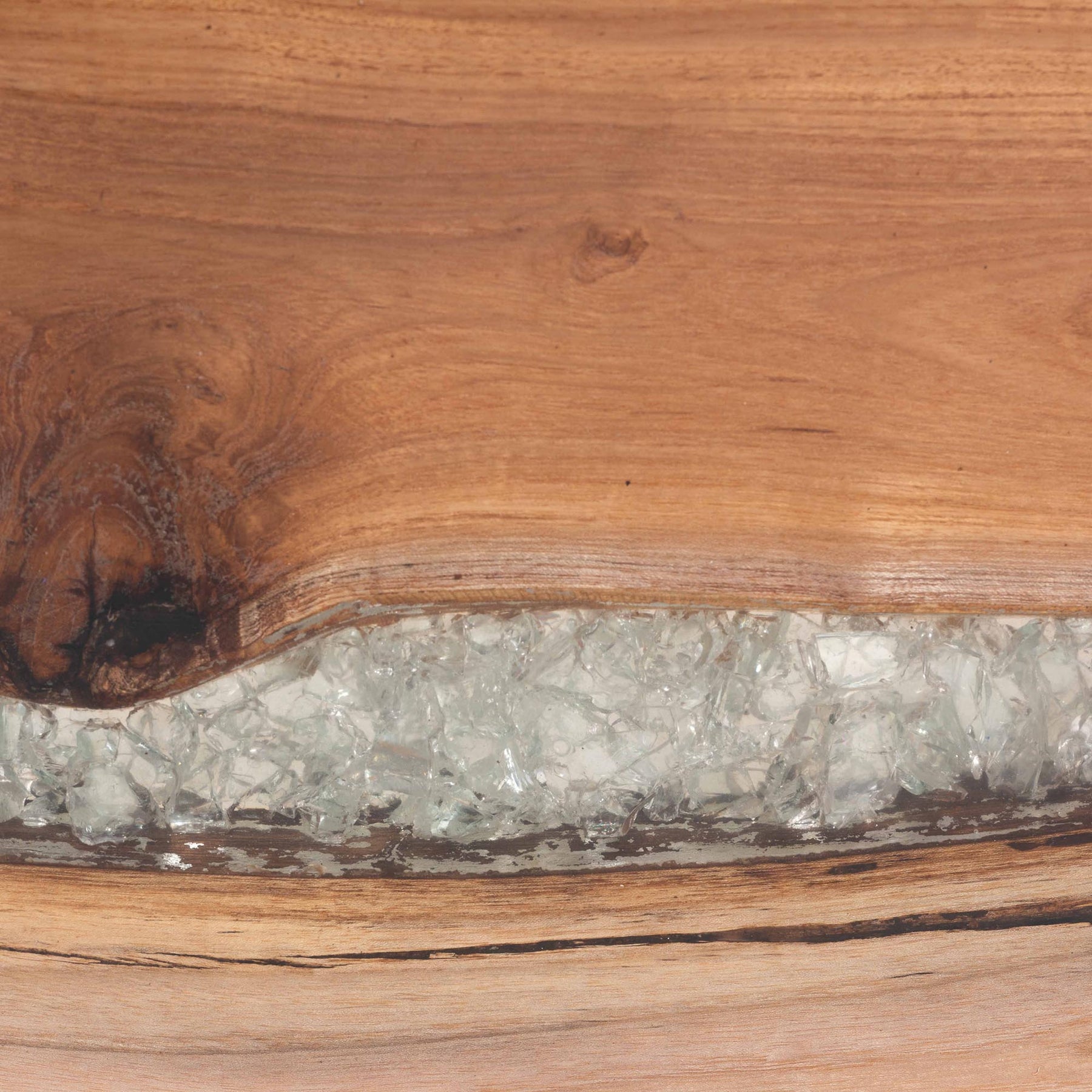 Natural beauty meets modern artistry in the Apio console table. Handcrafted from solid teak wood and organic glass inlay, each piece showcases a live-edge design enriched with translucent glass that highlights the wood’s natural grain and character. Supported by sleek metal sled legs, the Apio blends rustic warmth with contemporary sophistication, making it a stunning accent for any entryway or living space.