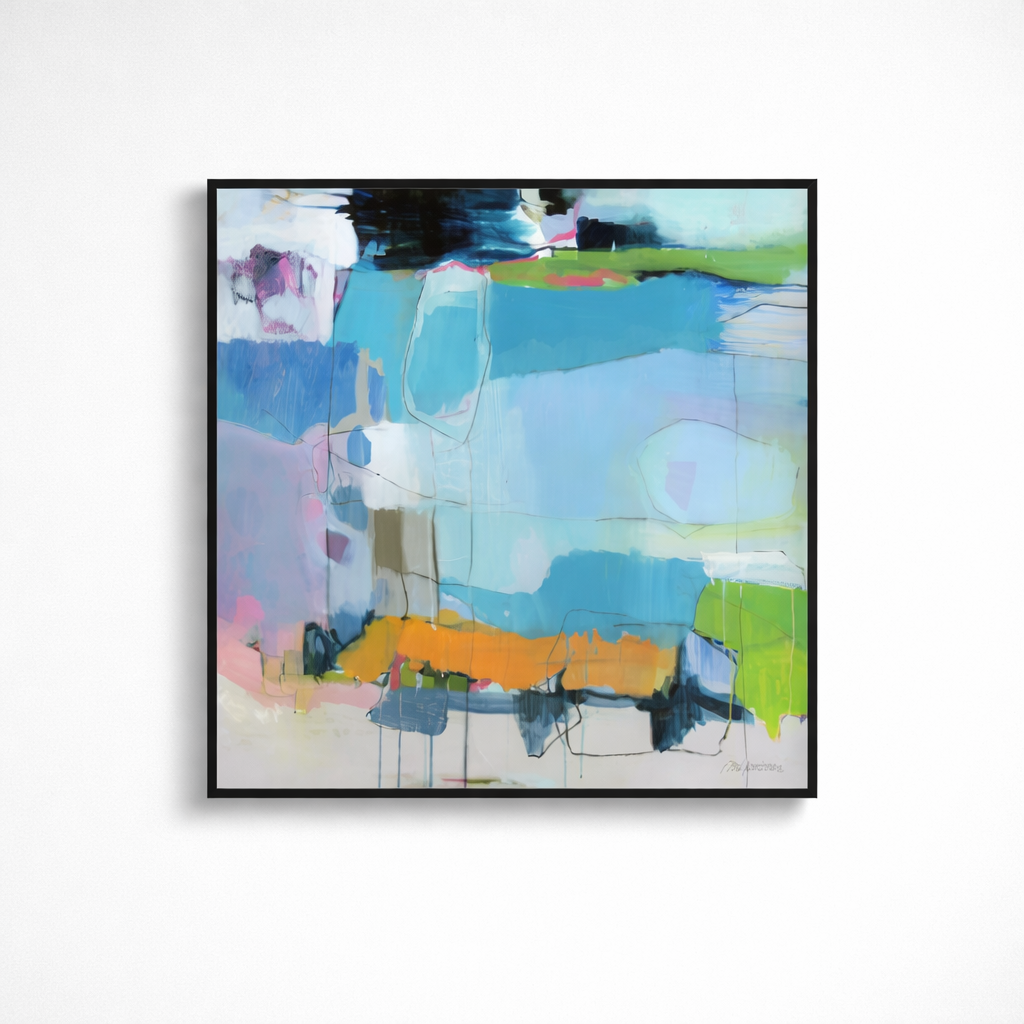 Taking the Plunge features a beautifully sophisticated application of color, with soft blush, aqua, sky blue, celadon, chartreuse, and warm ochre layered into a balanced abstract composition. Expressive linework and translucent passages create depth and movement, while the thoughtful placement of color gives the piece a refined, airy presence that feels both modern and artful.