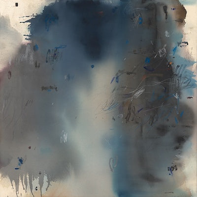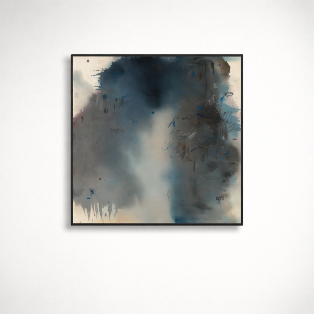 Thoughtful Discourse V is a striking abstract canvas featuring layered washes of deep blue, charcoal, soft gray, and warm neutral tones. Its atmospheric composition and expressive mark-making create a moody, modern focal point suited for contemporary interiors.