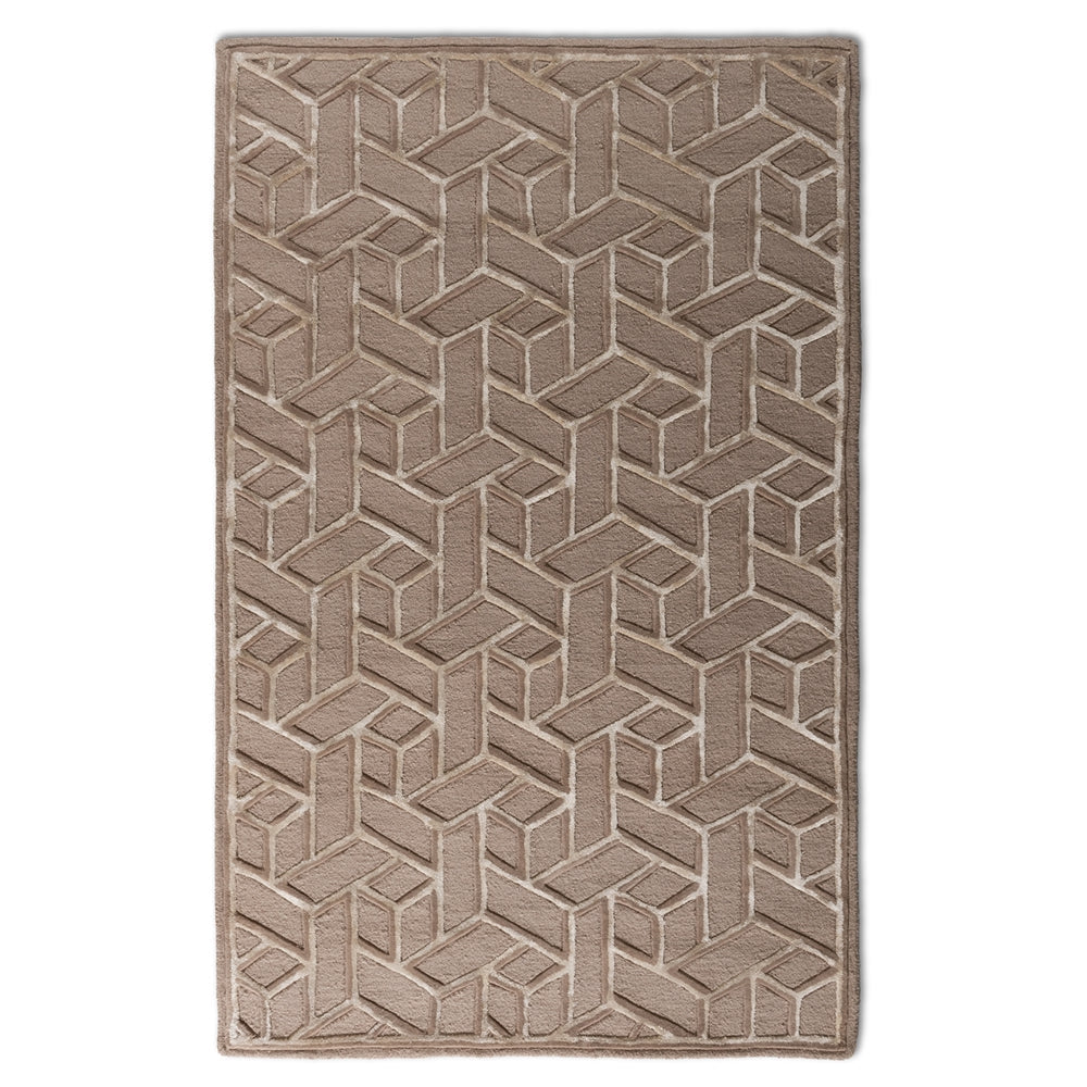 The Vigo Sand Area Rug. Hand-tufted in India from a premium blend of 78% wool and 22% viscose, this rug combines softness, durability, and modern artistry. The intricate angular pattern creates a dynamic, textured look that captures light beautifully, emphasizing the rug’s crisp design and warm sand tones.