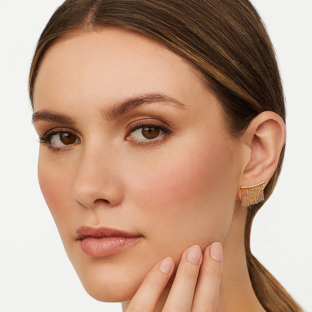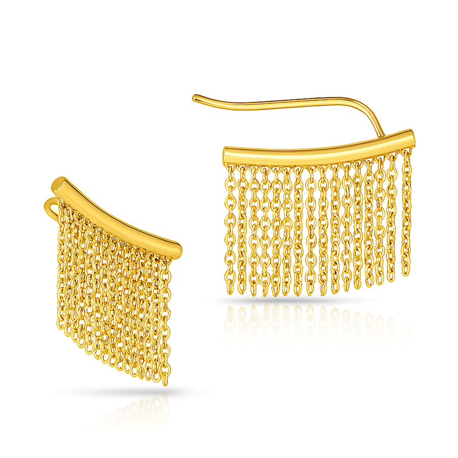 Hermosos eslabones de cadena con flecos de oro amarillo de 14k se reinventan en estos aretes trepadores contemporáneos y únicos. El arete trepador se mantiene en su lugar con alambre europeo.
