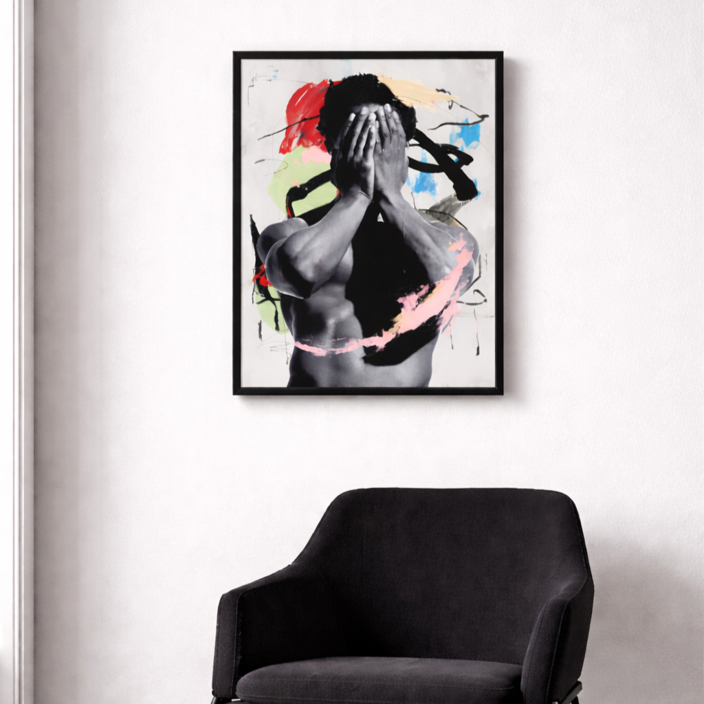 A modern photographic composition featuring a dramatic black-and-white figure accented with bold, painterly color strokes. Hand-embellished texture adds depth and movement, giving the piece a fresh, contemporary feel that blends fine art photography with expressive abstraction.