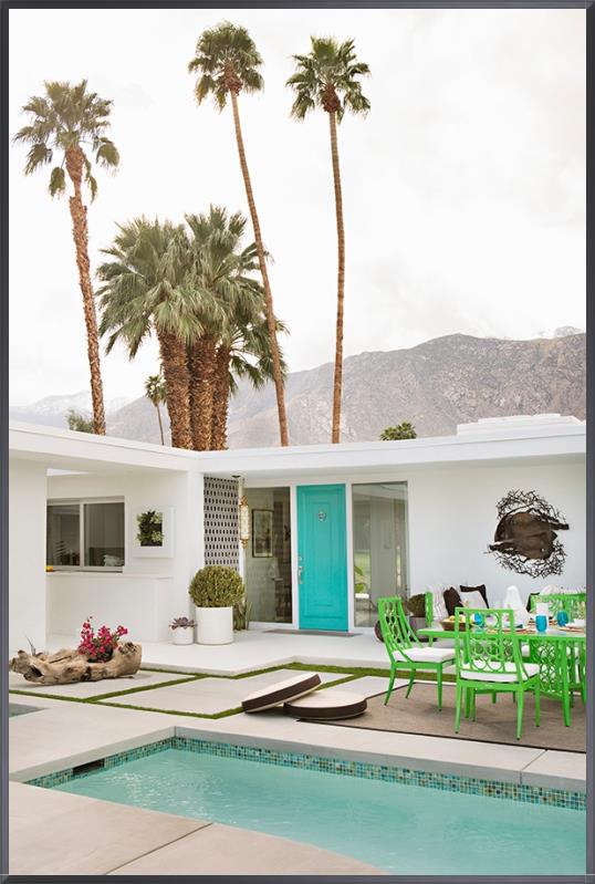 A bright, modern desert retreat captured in a serene architectural scene. Tall palms rise against soft mountain backdrops while a crisp white home, turquoise door, and vibrant green outdoor dining set create a refreshing, sun-washed oasis. The clean lines, open courtyard, and tranquil pool evoke the relaxed luxury of Palm Springs living, bringing a calm and uplifting atmosphere to any space.